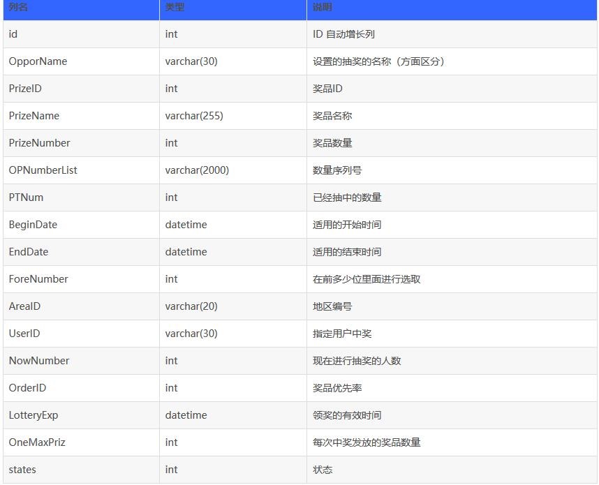 OPNumberList:中奖的次数列表。这个是为了吧奖品设置到每次抽奖的次数上面去,如果数量不是很大,就用varchar类型。